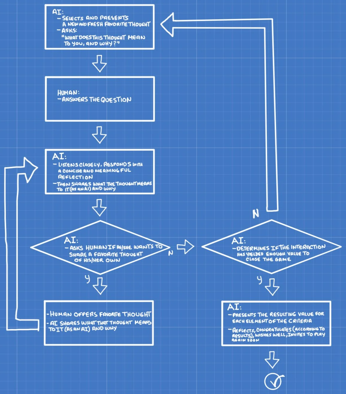 - If YES -> Human provides a thought, AI reflects back what that thought means to it as AI.